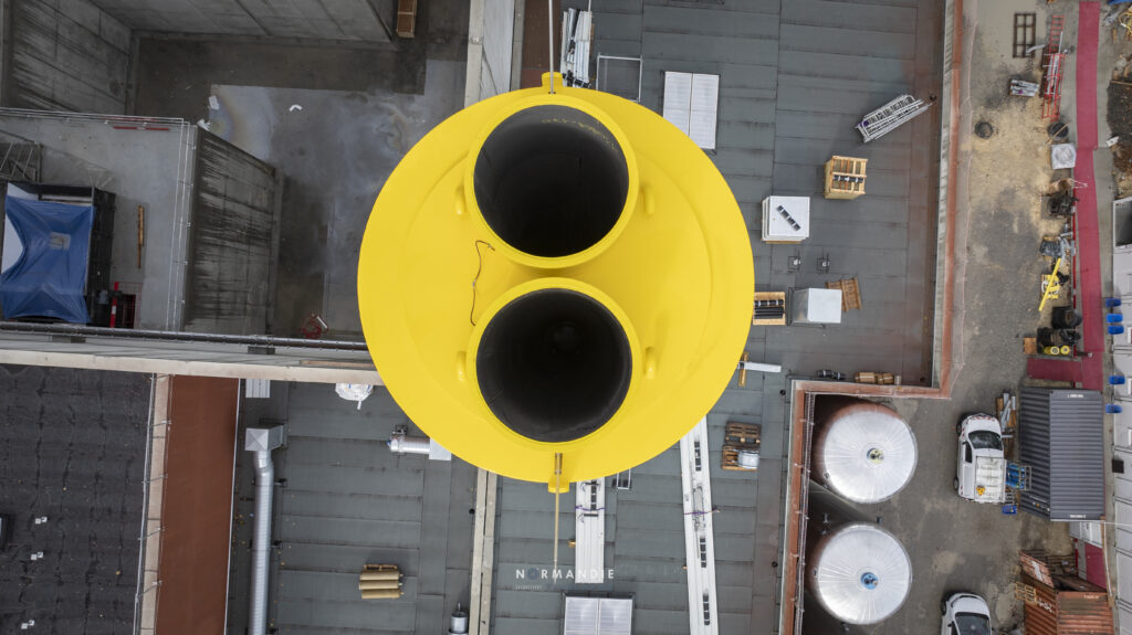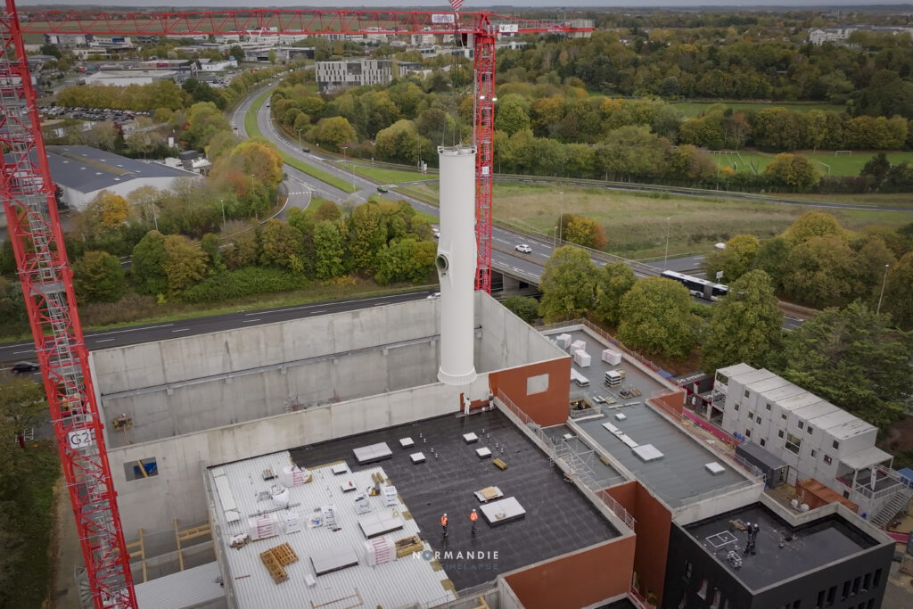 Le 21 octobre, d’imposants cylindres se sont dressés dans le ciel : les cheminées gaz de 34 mètres et biomasse de 37 mètres sont désormais facilement identifiables grâce à leur sommet jaune.